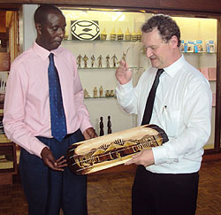 Alphonse Umulisa handing over a gift to Guido Gryseels (Photo; P. Ntambara)