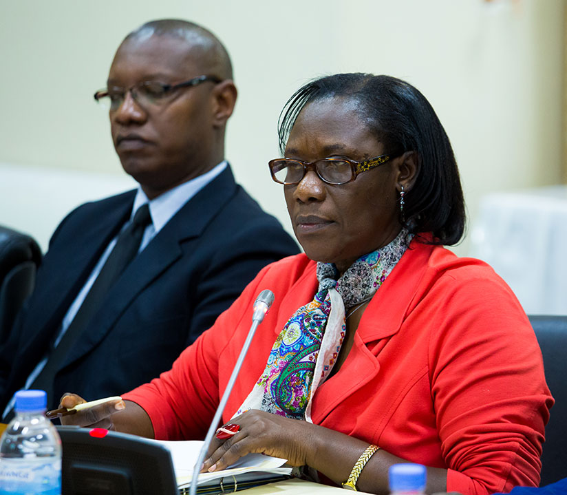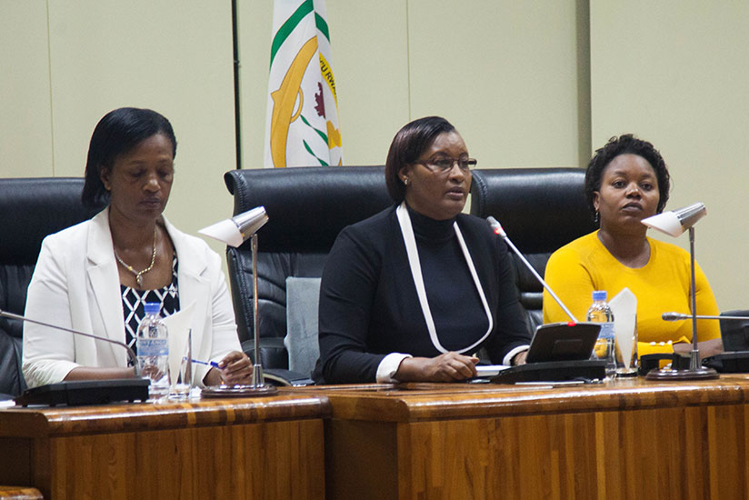 Speaker Mukabalisa (C), her deputy Jeanne d'Arc Uwimanimpaye (R) and Senate vice president Jeanne d'Arc Gakuba at the news briefing yesterday. / Nadege Imbabazi