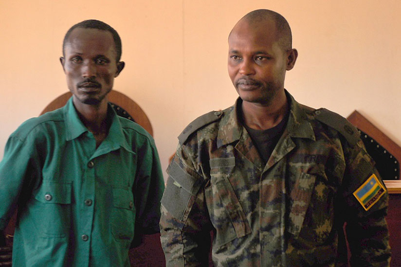 Major Aimable Rugomwa (R) and his co-accused Memertto Nsanzimana. / File