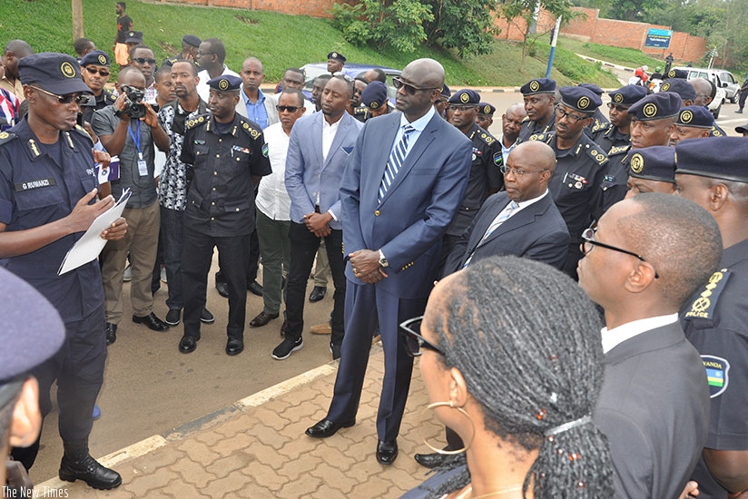 Rumanzi (L) explains to Justice minister Johnston Busingye how the new hi-tech traffic control device works. File.