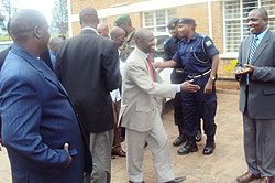 Mayor Francois Ntiyotwagira (Extreme right) flanked by RNP officers as he receives the Burundian delegation. (Photo S. Rwembeho)