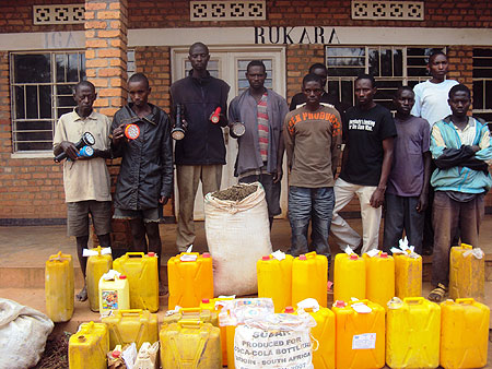 Poachers (with torches) and drug dealers(R) being paraded at Rukara Police Station (Photo; S. Rwembeho)