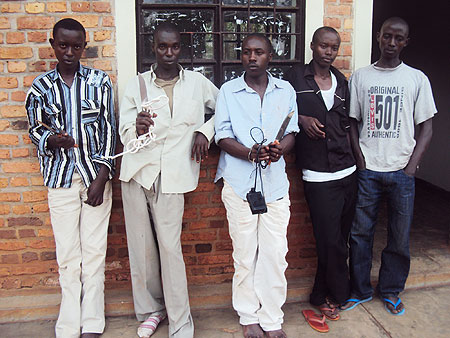 The suspects being paraded at Rwamagana Police Station with some of their weapons (Photo; S. Rwembeho)