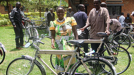 Bernadette Namakura one of the mediators admires her bicycle (Photo; S. Rwembeho)