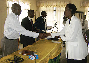 Anasthase Barinda hands over a certificate of participation to Venansia Kabazayirwa.