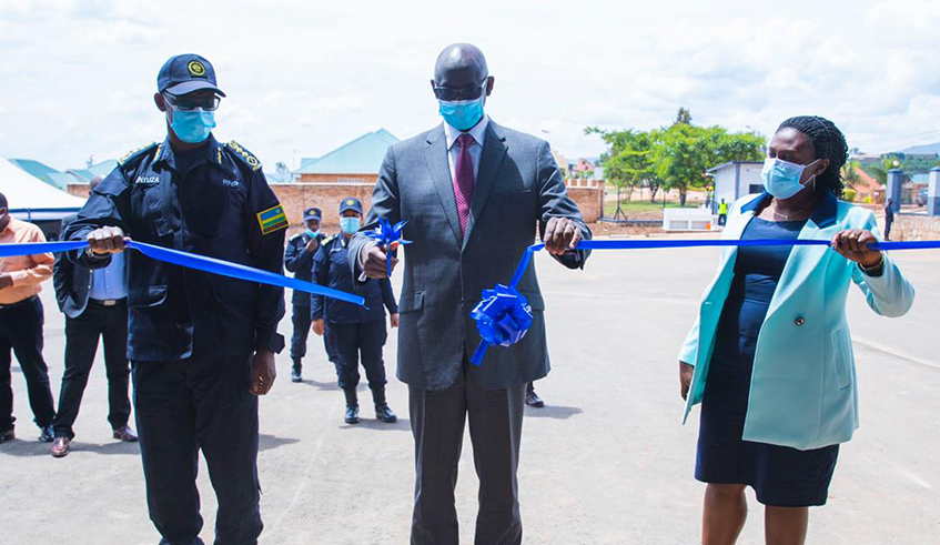 Minister Johnston Busingye, IGP Dan Munyuza and the Governor of the Southern Province, Alice Kayitesi cutting the ribbon to launch the Automobile Inspection Centre in Huye District.
