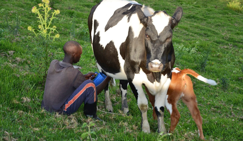 A farmer milks a cow in Nyagatare District in 2017. Discussions between the Government and Inyange Industries to establish a milk powder factory in the district are underway. The firm says it will process 500,000 litres of milk per day. / Photo: Sam Ngendahimana.