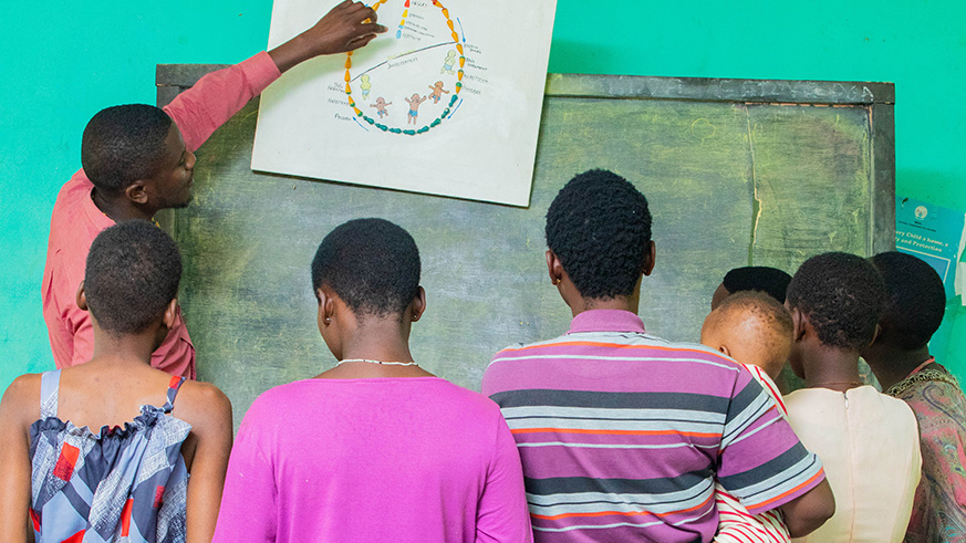 Teenage mothers at Centre Marembo in Gasabo District being taken through the reproductive cycle by a health worker. Emmanuel Kwizera.