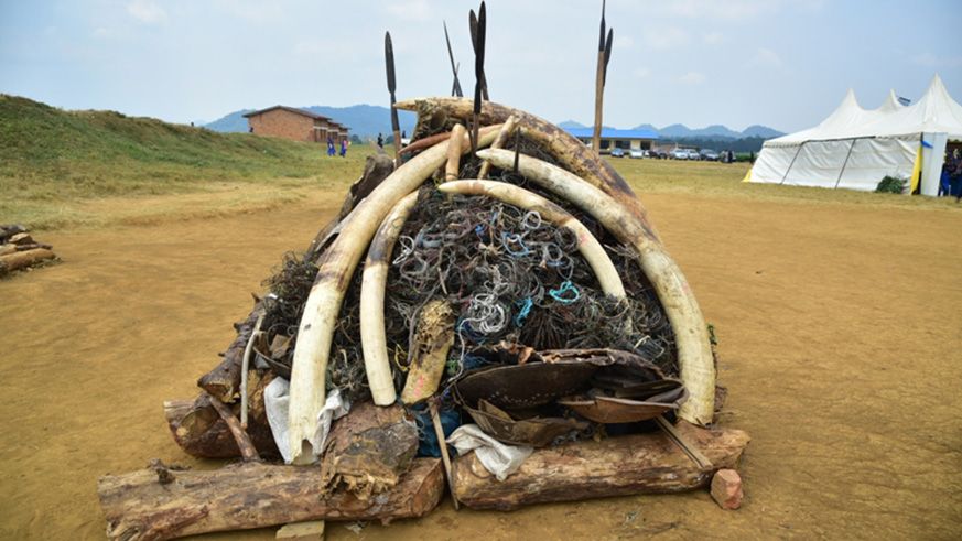 Elephant tusks being burnt in Nyamasheke District as a way of dissuading traffickers of endangered animal species. Net photo.