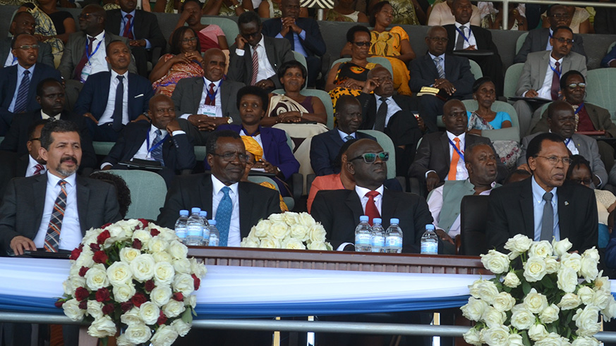L-R (front row): Abner De Los Santos, the general vice president at SDA General Conference; David Maraga, Chief Justice Kenya; Rwandau2019s Justice Minister Johnston Busingye; and Hesron Byilingiro, the SDA Rwanda Union President during the event at Amahoro National Stadium, Kigali on Saturday. Kelly Rwamapera.
