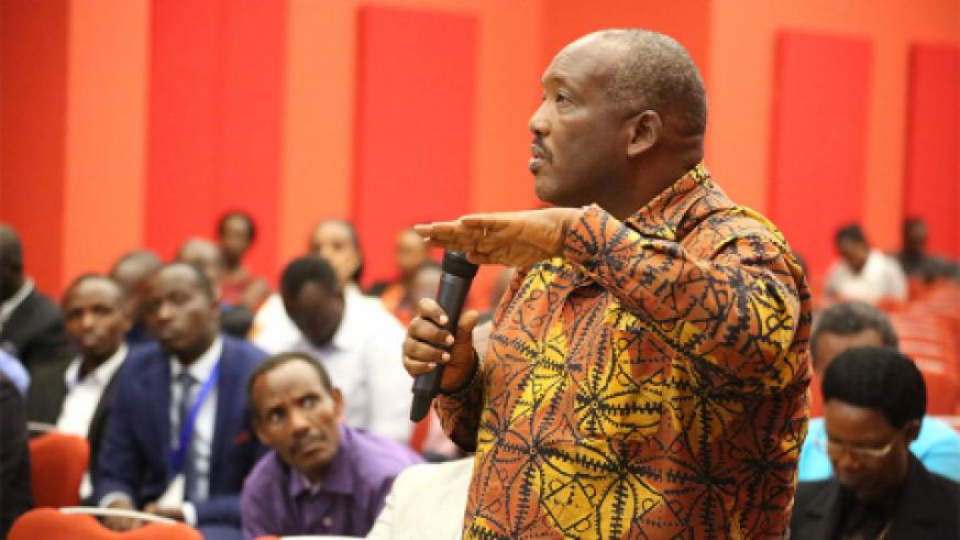 Prof. Jean Pierre Dusingizemungu, the president of IBUKA, makes a point during the conference in Kigali on Sunday. (Courtesy)