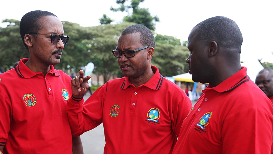 Rutabingwa (L) Busabizwa (C) and Janvier Gasana chat during the closure of Kigali City Councillorsu2019 Week at Petit Stadium in Kigali. / Sam Ngendahimana