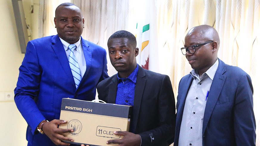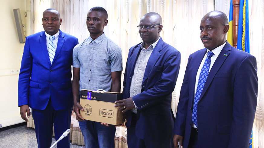 Pierre Byumvuhore, from EAV Kabutare receives a laptop as a reward for his performance from State Minister Isaac Munyakazi (Primary and Secondary Education) as his father looks on at the Ministry of Education headquarters in Kigali yesterday.  Photos by Sam Ngendahimana.