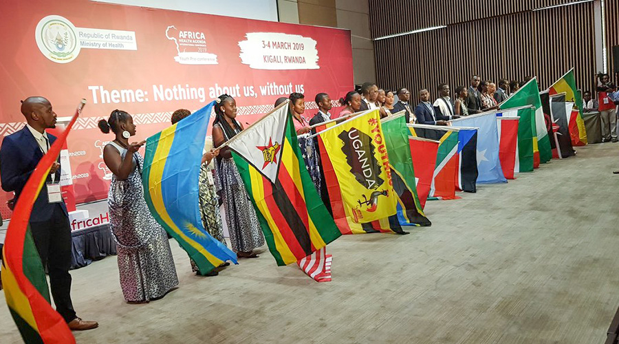 Some of the youth delegates drawn from 21 countries, with their respective countriesu2019 flags, at Kigali Convention Centre for a pre-conference youth event ahead of the Africa Health International Conference, yesterday. The conference proper is slated to open tomorrow in Kigali. Officials said there are plans to scale up the number of youth centres (multipurpose facilities) nationwide, up from 28 currently. / Courtesy.