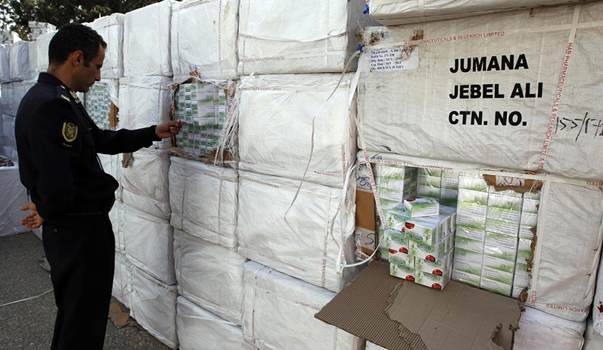 A Libyan police officer views a haul of prescription drug Tramadol seized from a shipping container in Tripoli. Net photo.