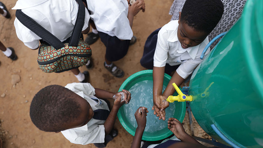 Mizero washes his hands at Umuco Mwiza School in Kimironko Sector, Gasabo District. E. Kwizera.
