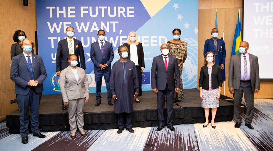 Prime Minister Edouard Ngirente is joined by heads of UN agencies in Rwanda and other officials at the celebration of the 75th anniversary of the UN in Kigali on Monday Sept 21.