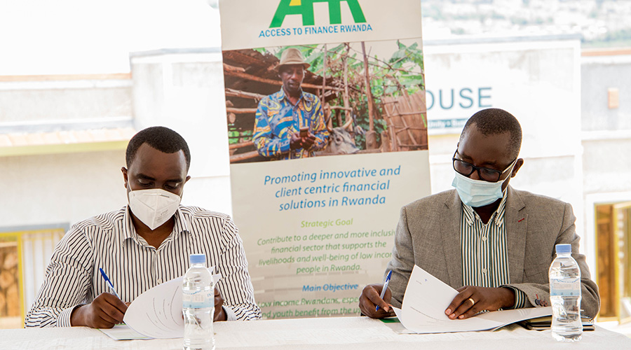 Aimable Nkuranga (left), Executive director of AMIR and Jean-Bosco Iyacu Acting country director sign an MoU which will allow the deployment of a core banking software that will automate the SACCOsu2019 business operations on October 7.