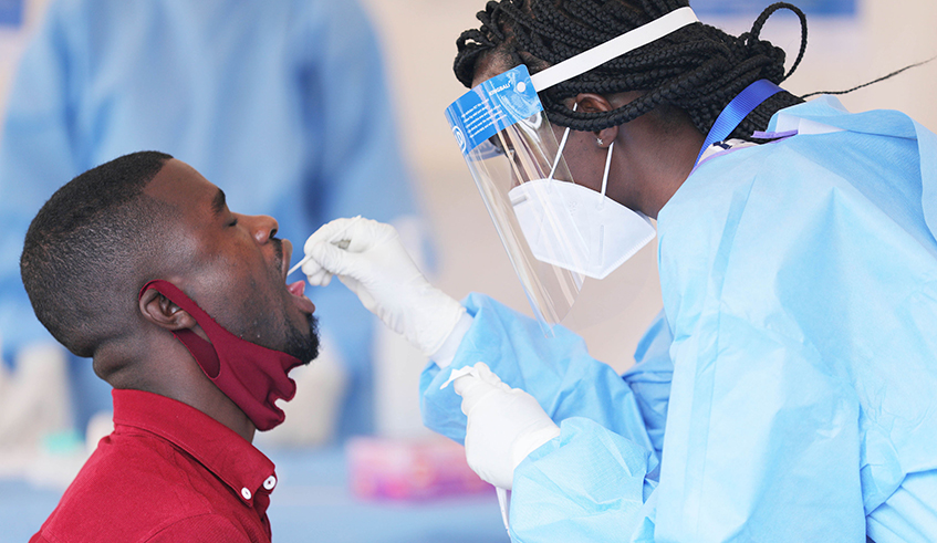 A health worker tests a man for Covid-19 in Kigali recently. / Photo: File.