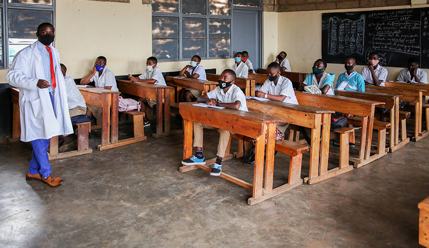 S.5 students at Groupe Scolaire Remera Protestant observe Covid-19 guidelines during a lesson on November 3 . The Government has moved to reassure the public on the Covid-19 situation in schools. / Photo: Dan Nsengiyumva.