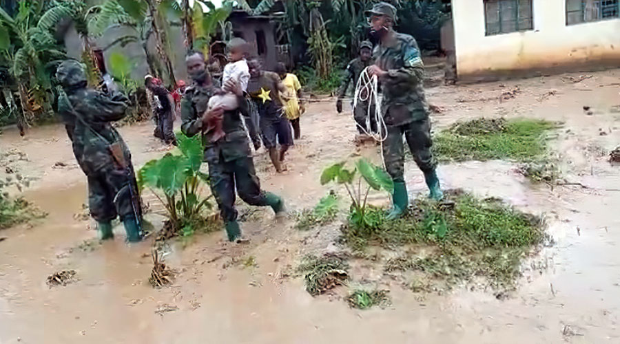 Members of the Rwanda Defence Force rescue some of the residents affected by flooding caused by Sebeya River in Rubavu District on February 10.