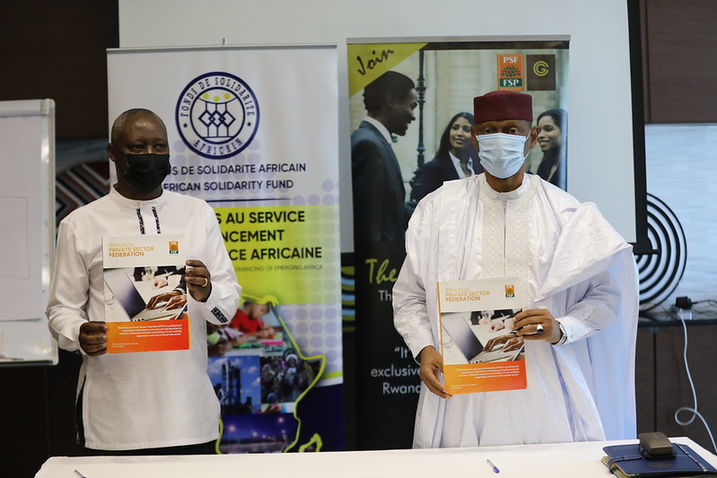 Chairman of Private Sector Federation-Rwanda, Robert Bafakulera and Director General of African Solidarity Fund, Ahamadou Abdoulaye Diallo sign an MoU intended to strengthen collaboration on Friday.