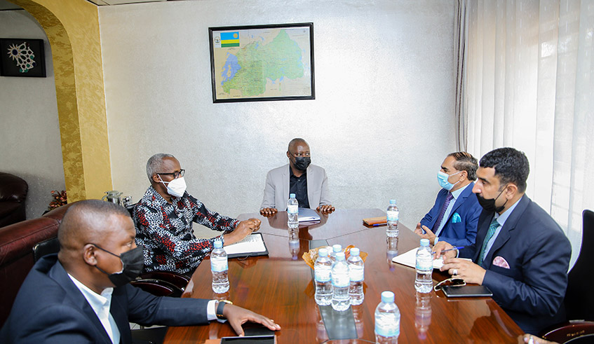 Pakistani High Commissioner to Rwanda Amir Muhammad Khan (2nd right) speaks during the meeting with Robert Bafakulera, the Chairperson of the Private Sector Federation (centre) as other officials look on in Kigali on August 31. / Photo: Dan Nsengiyumva.