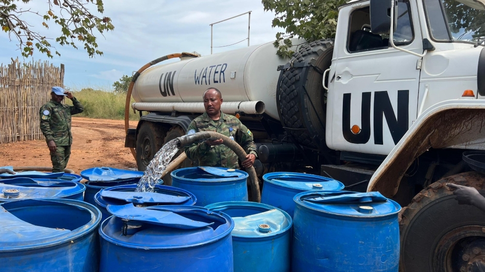 Rwandan peacekeepers from the UN Mission in South Sudan provide water to local communities in Ahmadi village, Juba, Central Equatorial State, during humanitarian activities, on Friday, October 2024.