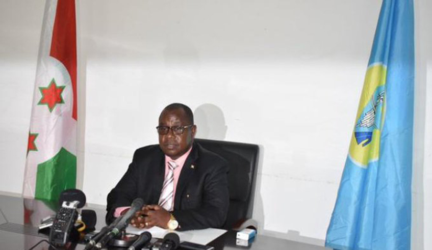 Adan Mohamed, Chairperson of the EAC Council of Ministers, addressed the media in the company of Ezechiel Nibigira, Burundiu2019s Minister for EAC Affairs, Peter Mathuki, EAC Secretary General, and Christophe Bazivamo, EAC Deputy Secretary General in charge of Productive and Social Sectors. / Courtesy