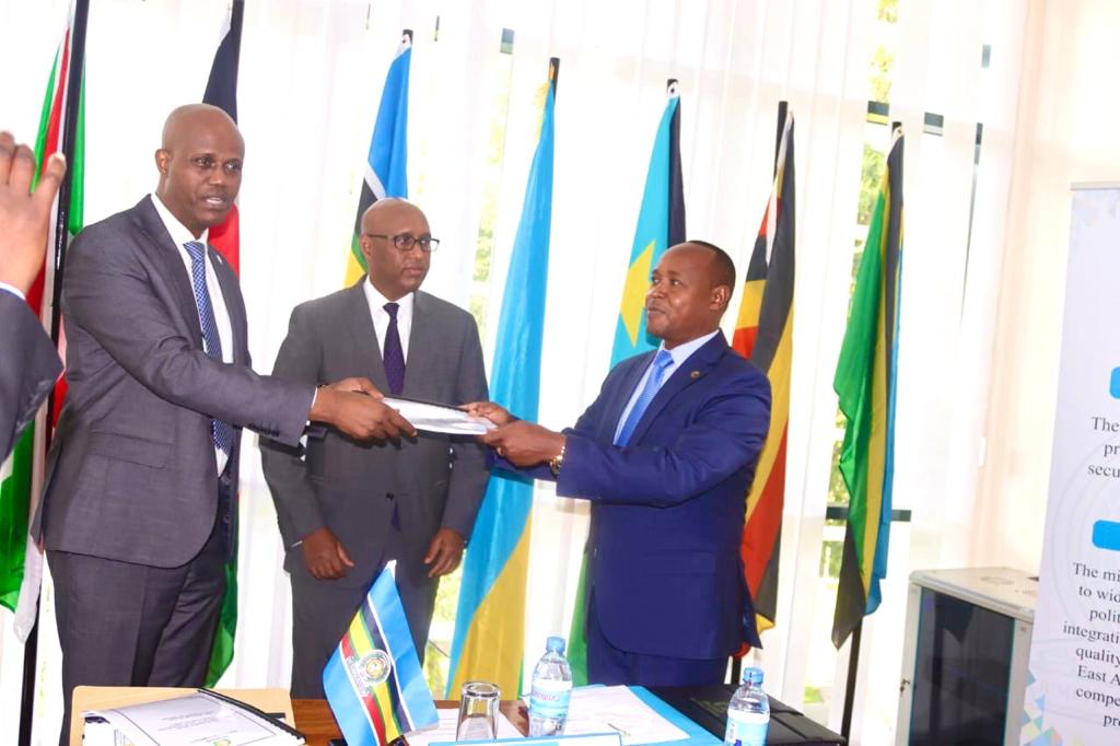 Incoming East African Community Secretary General Peter Mathuki (R) taking over from his predecessor Liberat Mfumukeko on Friday last week.