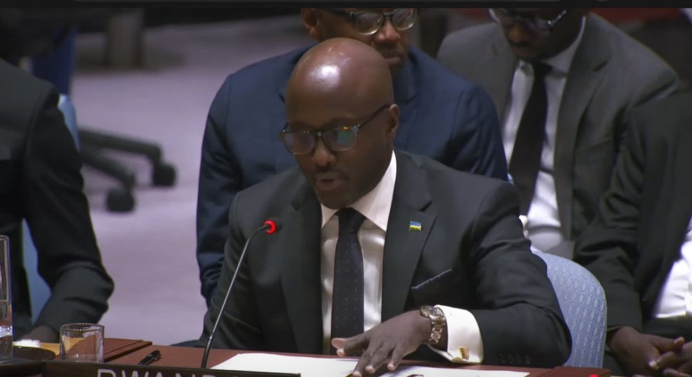 Rwanda’s Permanent Representative to the UN Ernest Rwamucyo, addresses the UN Security Council. Courtesy