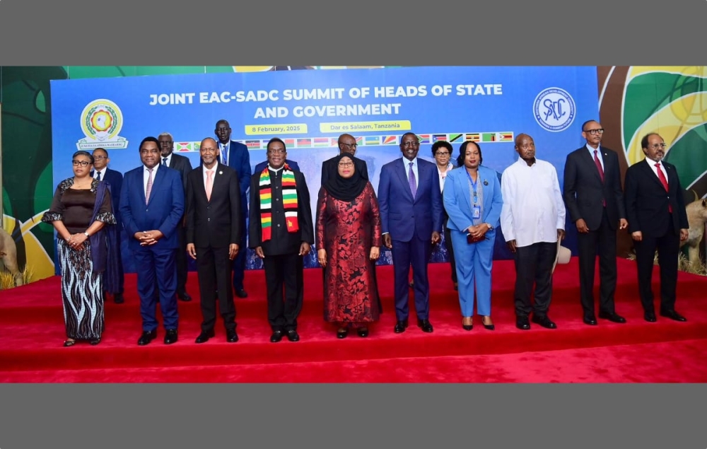 Heads of State and Government from the East African Community  and Southern African Development Community  pose for a photo at the joint meeting  in Dar es Salaam, Tanzania. Courtesy
