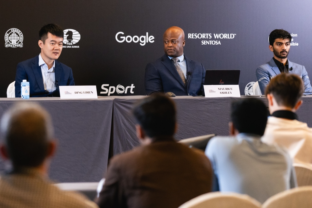 World Champion GM Ding Liren (left) and India’s GM Gukesh Dommaraju (right), during Game 13 of the 2024 FIDE World Championship match at Singapore's Equarius Hotel in Resorts World Sentosa, on Wednesday, December 11. Courtesy of FIDE