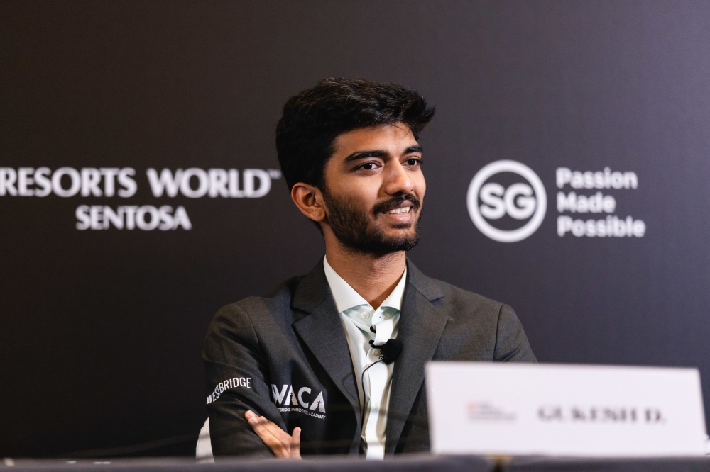 GM Gukesh Dommaraju smiles after making a strong comeback, handing defending champion GM Ding Liren his first loss of the FIDE World Chess Championship 2024 in the third round at the Resorts World Sentosa in Singapore, on Wednesday, November 27. Courtesy of FIDE