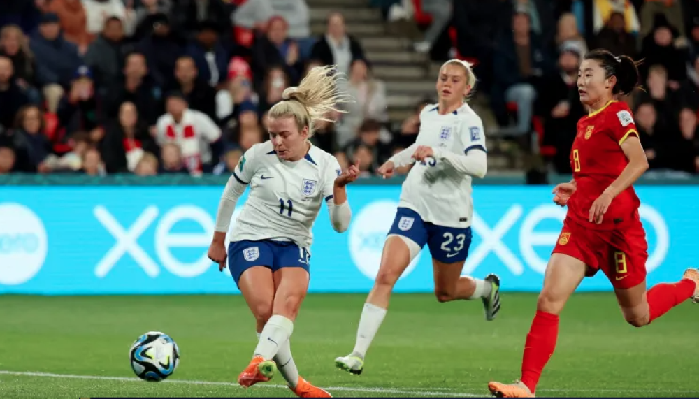Lauren Hemp scores England's second goal against China at Hindmarsh Stadium in Adelaide, Australia [Asanka Brendon Ratnayake/Reuters]