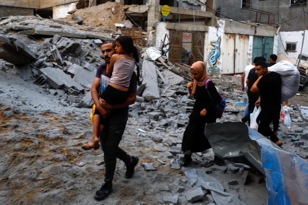 Palestinians carry their belongings as they walk on a debris-strewn street in the aftermath of Israeli strikes in Gaza City [Mohammed Salem/Reuters]