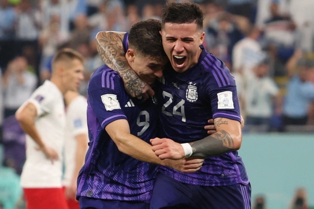 Julian Alvarez, left, celebrates scoring Argentina's second goal with Enzo Fernandez [Amanda Perobelli/Reuters]