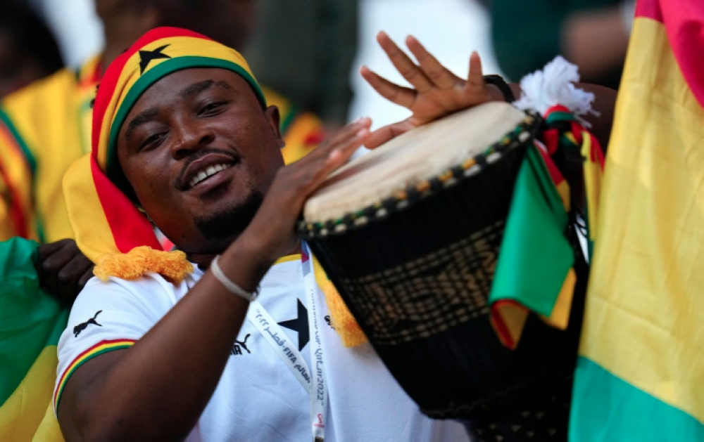 A Ghanaian fan plays a traditional drum prior to the World Cup group H football match between South Korea and Ghana, at the Education City Stadium in Qatar, Monday, November 28, 2022. [Julio Cortez/AP Photo]