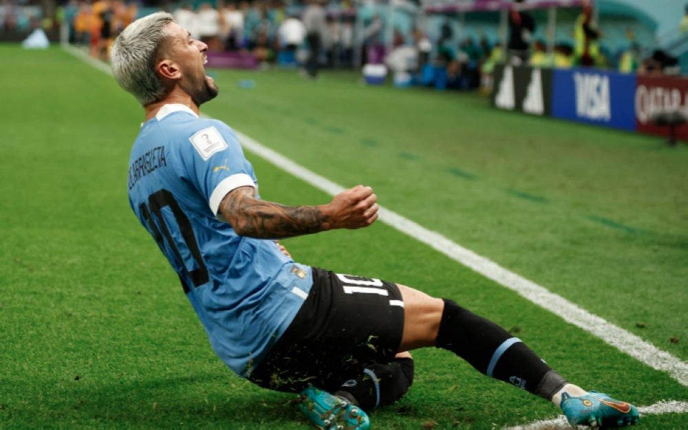Uruguay's Giorgian de Arrascaeta celebrates scoring their second goal [John Sibley/Reuters]