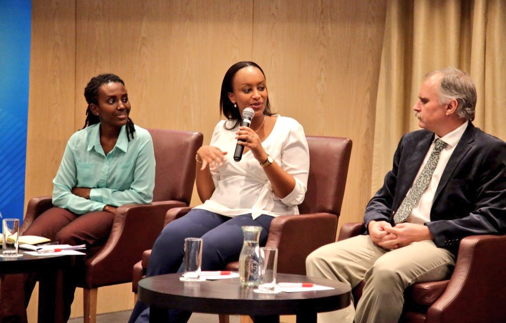 Col. Silas Udahemuka, the Director-General Rwanda Civil Aviation Authority, Yvonne Makolo managing director and chief executive officer of Rwandair during the workshop at Ubumwe Grand Hotel on May 17, 2021. (Dan Nsengiyumva)
