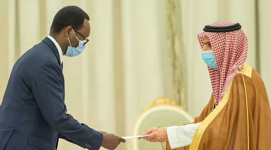 Franu00e7ois-Ru00e9gis Rukundakuvuga (in suit) and Aimu00e9 Kalimunda (in gown).