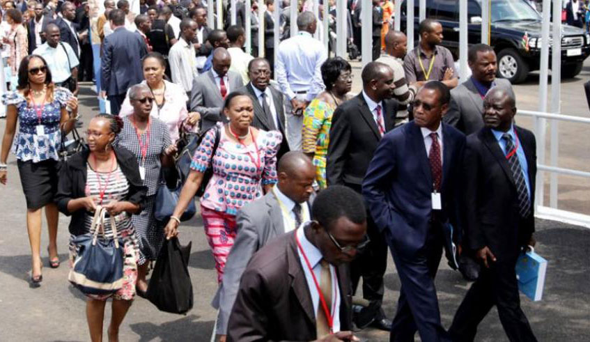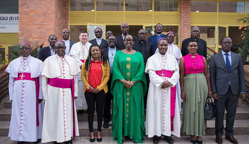 R-L: Wilfred Kiboro, Nation Media Group Chairman; Moussa Faki Mahamat, the Chairperson of the African Union Commission; First Lady Jeannette Kagame; President Paul Kagame; DR Congo President Fu00e9lix Tshisekedi; Raila Odinga, the Africa Union High Representative for Infrastructure Development; Vera Songwe, Executive Secretary of the United Nations Economic Commission for Africa; and Vincent Biruta (extreme left) in a group photo during the inaugural u2018Kusi Ideas Festivalu2019 at the Intare Conference Arena on Sunday.