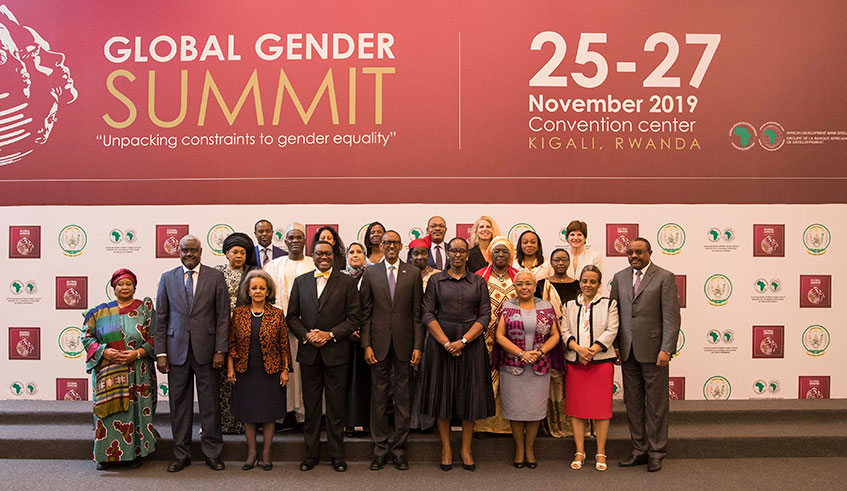 President Kagame, Sheikh Tamim Bin Hamad Al Thani, the Emir of Qatar (back row, 2nd left), Namibian President Hage Geingob (back row left) Gianni Infantino the FIFA President, AU Commission Chairperson Moussa Faki Mahamat and the Qatari Attorney General , Ali Bin Fetais Al-Marri among other dignitaries, join the ACE 2019 laureates in a group photo in Kigali on Monday.   Photo: Village Urugwiro.