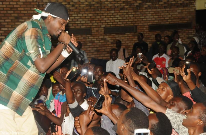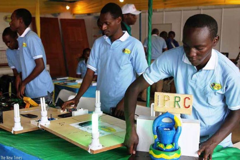 The winner of the mobile application competition, Igiraneza (2nd Right), compares notes with  the other contestants during the ceremony in Kigali, on Monday. (Faustin Niyigena)