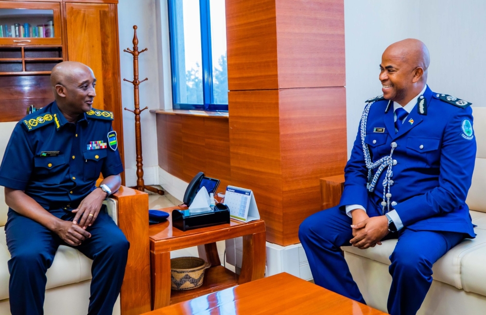 The Inspector General of Police (IGP) Felix Namuhoranye meets his Seychelles counterpart Commissioner of Police (CP) Ted Barbe, at Rwanda National Police  Headquarters on Tuesday, September 24. Courtesy