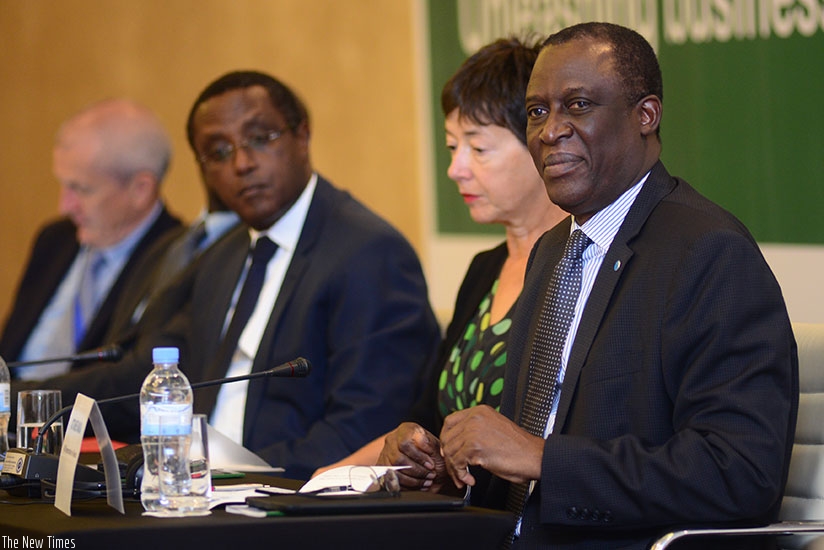 FAO Country Director Gualber Gbehounou addresses the meeting as Cesar Alvarez, Senior Information Technology Officer at FAO looks on in Kigali on Wednesday . Sam Ngendahimana