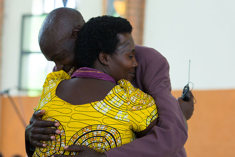 George Ouma, National Chairman of East and Southern Africa Civil Society Network (left), hands a set of the report copies to Alexis Mucumbitsi, head of nutrition and hygiene department at National Early Childhood Development Programme, in Kigali, yesterday. Nadege Imbabazi.