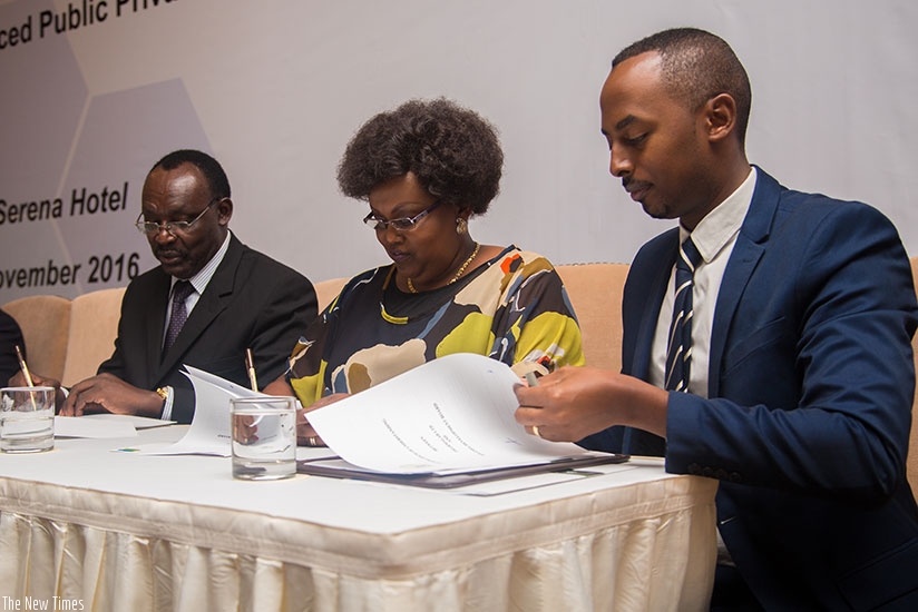 Pascal Ruganintwali, Deputy Commissioner General of RRA (right), and RSSB Director General Jonathan Gatera, during the launch of unified declaration for PAYE, Pension & Occupational Hazards, and Medical & Maternity leave.