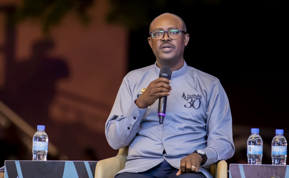 Rwanda Development Board CEO Jean-Guy Afrika addresses hospitality stakeholders on the Tourism Operating License (TOL), as Irène Murerwa, Chief Tourism Officer looks on, during a meeting in Kigali on August 20. Photo by Emmanuel Ntirenganya