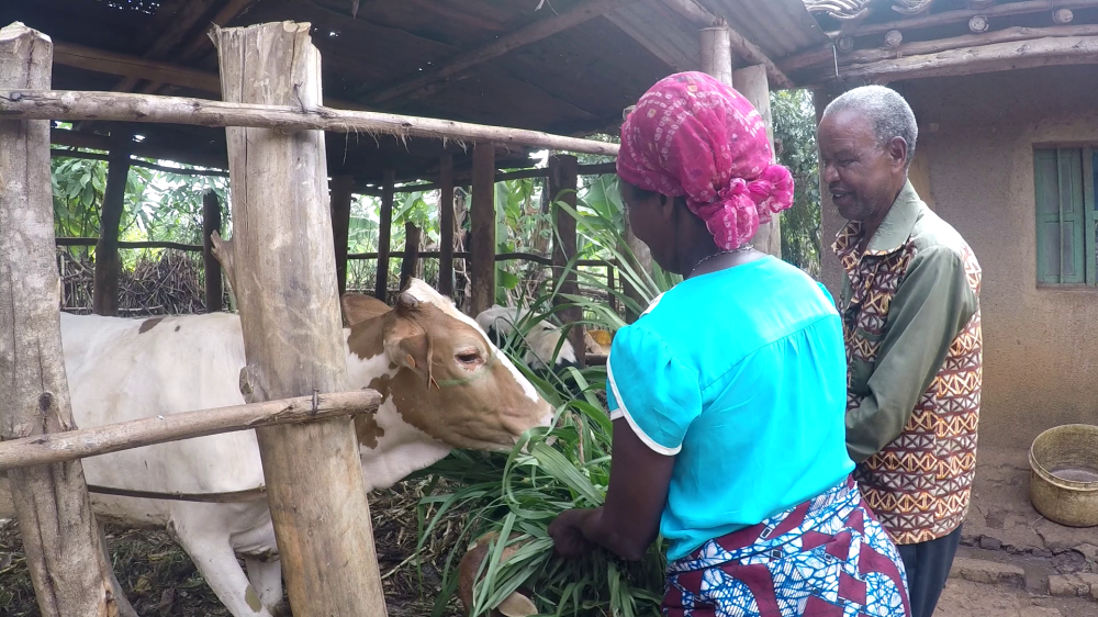 Deo Sindikubwabo and his wife Esperance Mukamana feed cattle together.